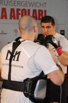 Mit großer Wucht feuert er ein ums andere Mal mit wechselnden Kombinationen in die Pratzen seines neuen Trainers Varol Vekioglu, Der 31-jährige Herausforderer will keine Zweifel aufkommen lassen und demonstrierte, wie gewissenhaft er sich auf den nach eigenem Bekunden „wichtigsten Kampf meines Lebens“ gegen IBO-Titelträger Ola Afolabi vorbereitet hat. Als er am Ende der zweiten Pratzenrunde abschließend eine harte Rechte auf der Leber seines Trainers landet, muss der trotz Protektoren sichtlich beeindruckte Chefcoach das öffentliche Training beenden. „Ich rechne mit einem langen Kampf, aber so gut, wie ich mich fühle, kann es auch ein schnelles Ende geben“, so Huck, „Ola ist bekannt dafür, dass er ein besonders gutes Kinn hat und auch die härtesten Schläge einstecken kann, ohne zu Boden zu gehen. Aber er soll sich für Samstag warm anziehen, denn ich werde gewinnen.“