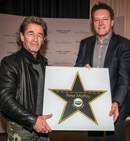 Grund genug für Ralf Weber, den 68-jährigen Sänger vor seinem Live-Auftritt beim mit 7.100 Besuchern erneut ausverkauften GERRY WEBER STADION mit einem „Walk of Fame-Stern“ zu ehren. „Eigentlich hat Deine Karriere bei uns 2002 begonnen, denn anschließend wurde Dir eine Fernsehshow angeboten. Und damit Du weiterhin zu uns kommst, verleihen wir Dir auch für diese freundschaftliche Verbundenheit einen Stern.“ So wurde am heutigen Sonntagmittag Peter Maffay der 40 Zentimeter x 40 Zentimeter grüne Glasstern überreicht - mit seinen Auftrittsjahren (1996, 2001, 2005, 2007, 2010, 2011, 2012 mit Tabaluga, 2015, 2016 mit Tabaluga, 2018) im GERRY WEBER STADION. Anschließend wurde der „Walk of Fame“-Stern in den Boden eingelassen und liegt nun beleuchtet zwischen den Weltstars Luciano Pavarotti und Whitney Houston. „Den Erhalt dieser Auszeichnung empfinde ich als große Ehre“, zeigt sich Maffay sichtlich erfreut. „Eine solche Würdigung ist mir noch nicht zuteil geworden.“